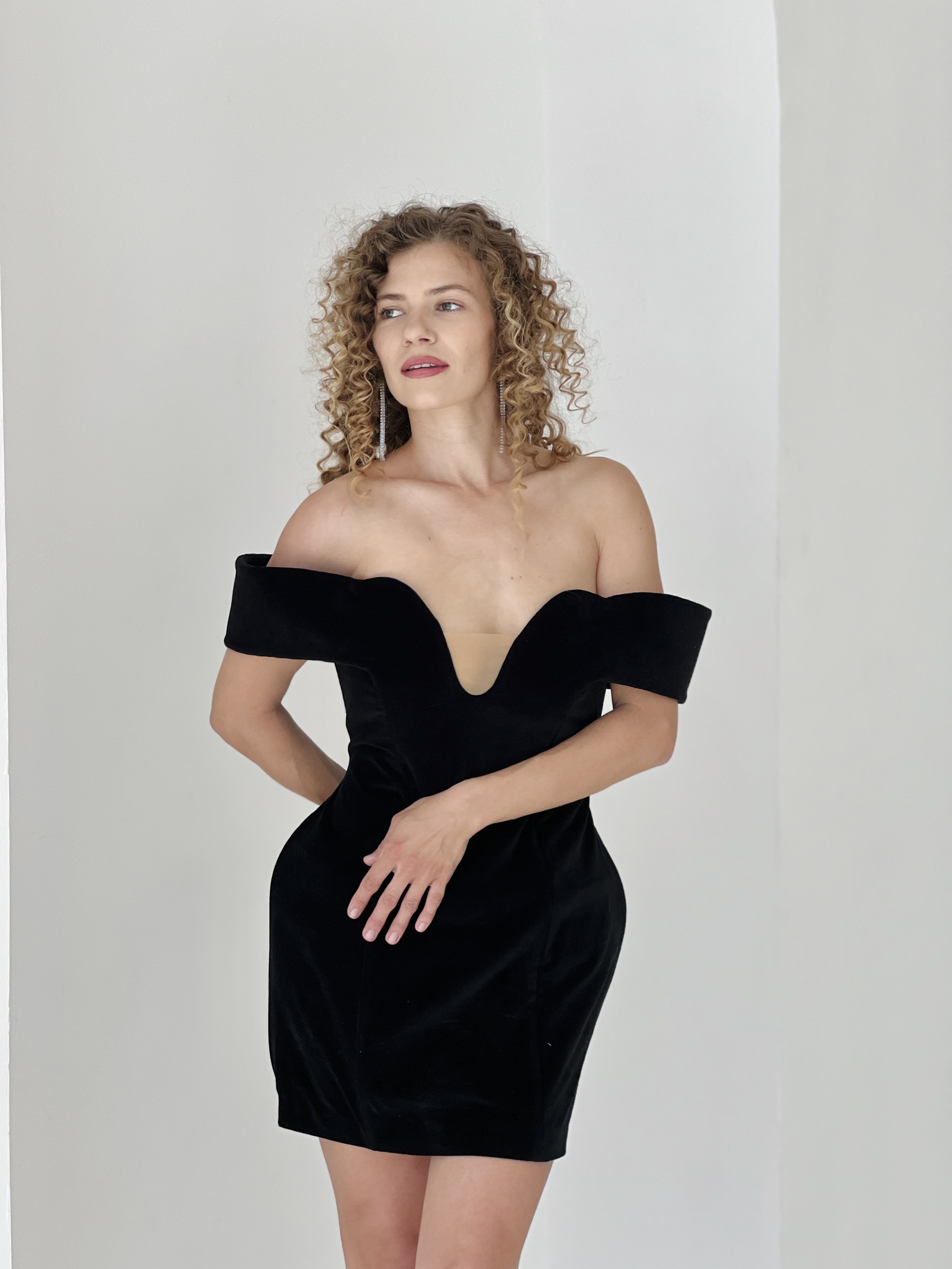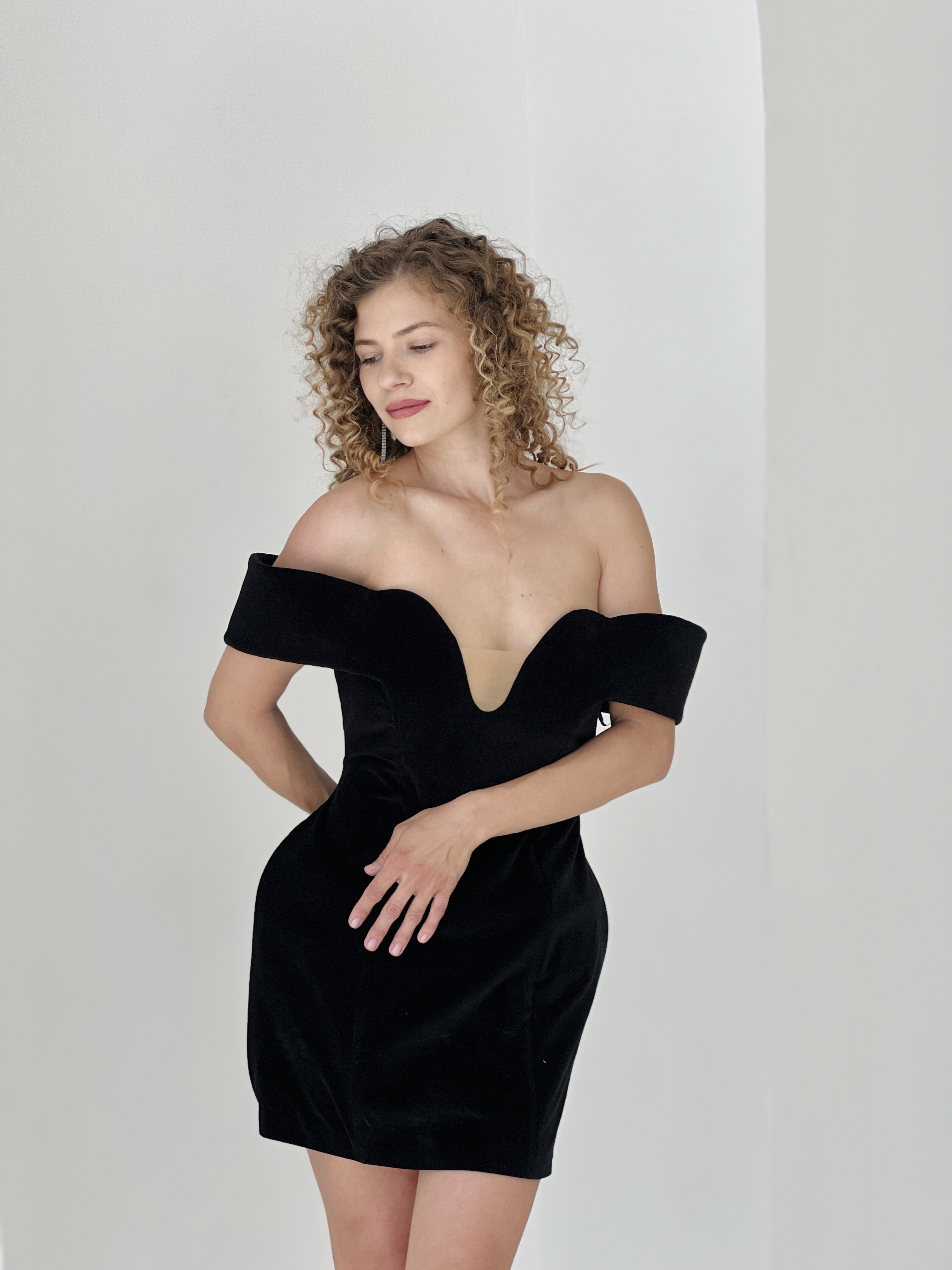 Платье из плотного бархата на корсетной шнуровке. Открытые плечи создают соблазнительный образ. Платье подчеркивает достоинства вашей фигуры благодаря крою "песочные часы". Комплектуйте с высокими сапогами или босоножками на шпильке – это must-have вашего вечера!