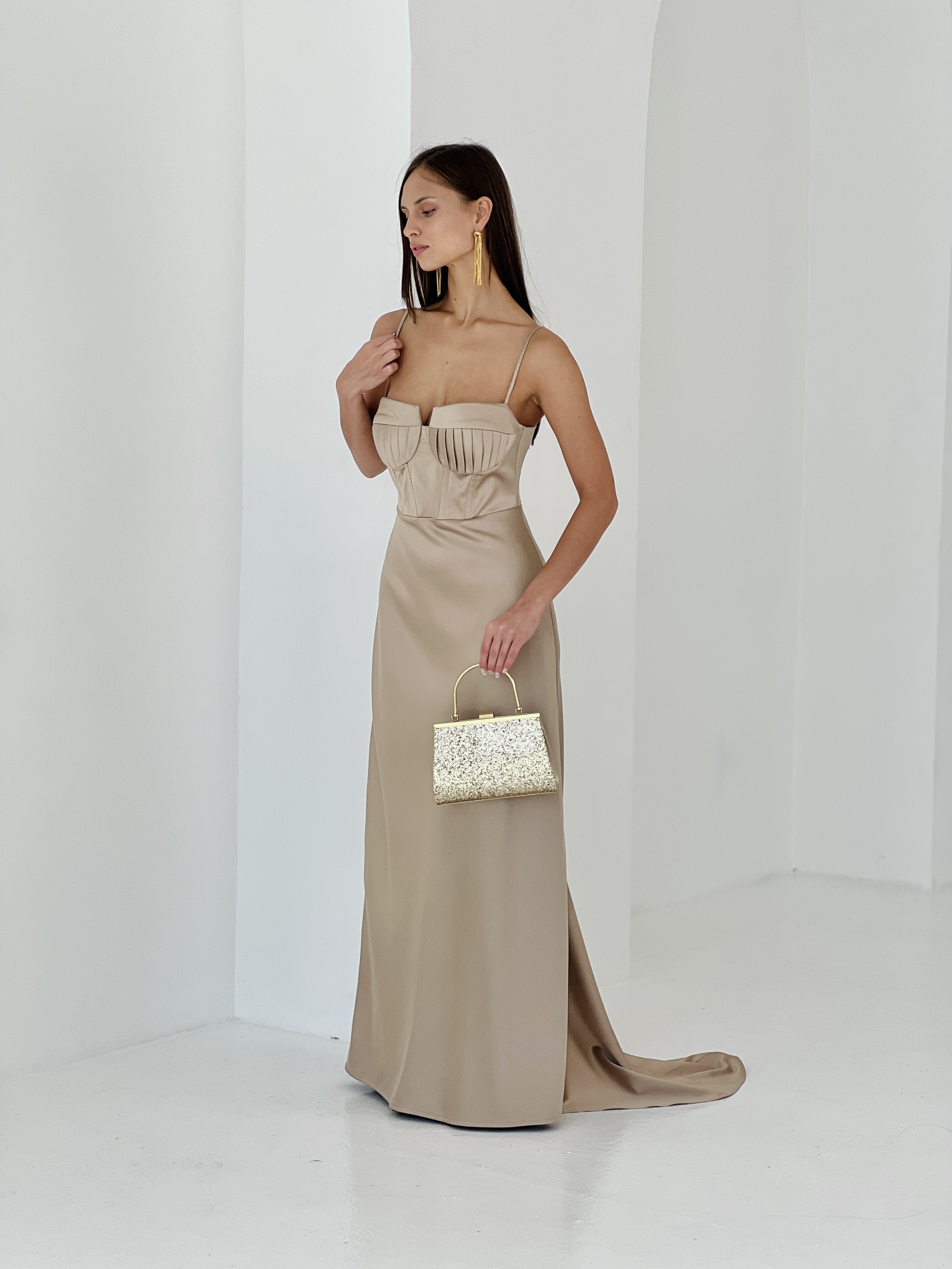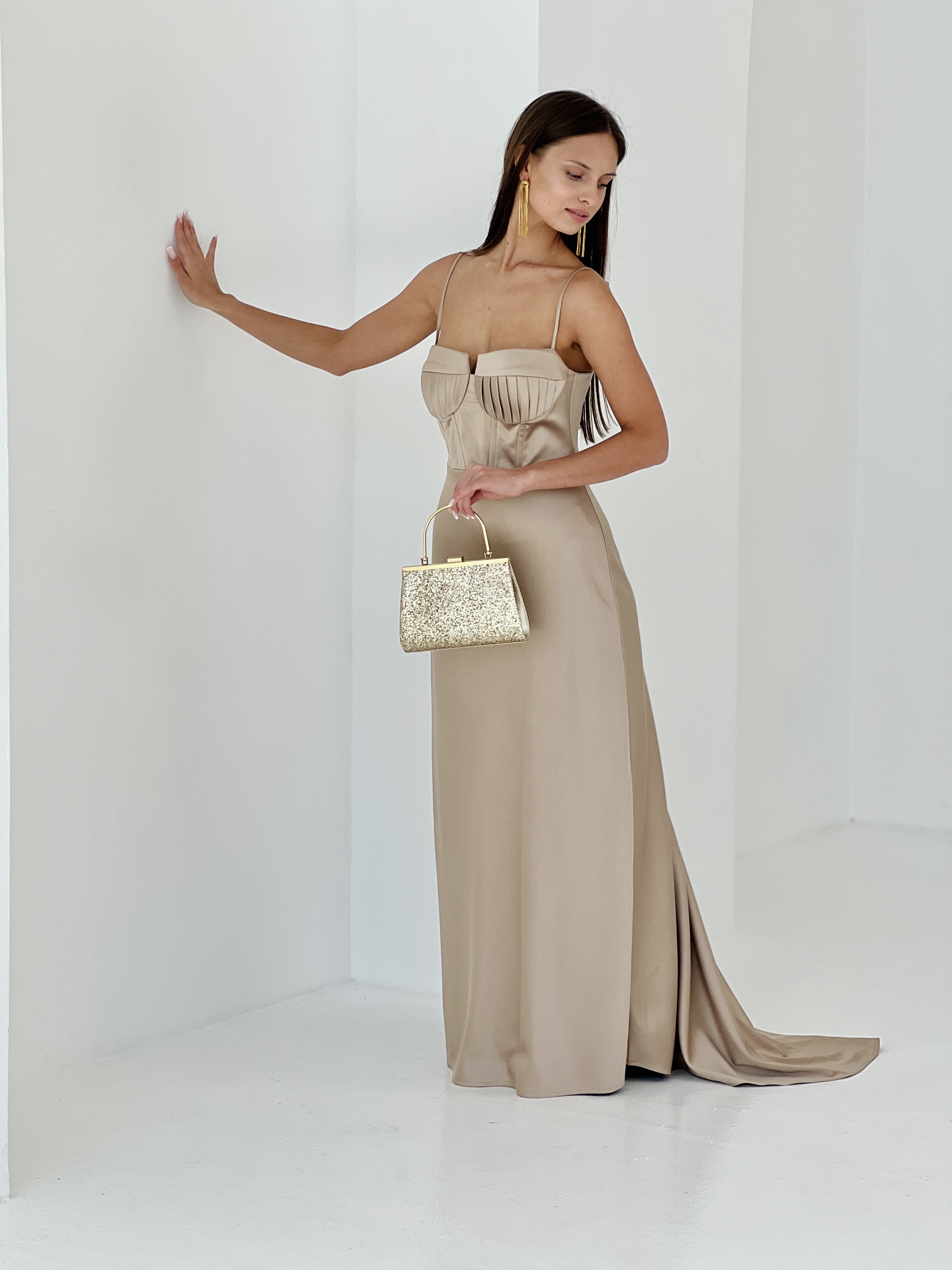 Вечернее платье в бежевом цвете из плотного атласа. Декорированные чашки создают изящный акцент вечернего образа. Платье подчеркивает женственность силуэта благодаря идеально скроенному корсету и плавной линии талии. Небольшой шлейф. Садится на любую фигуру благодаря корсетной шнуровке.