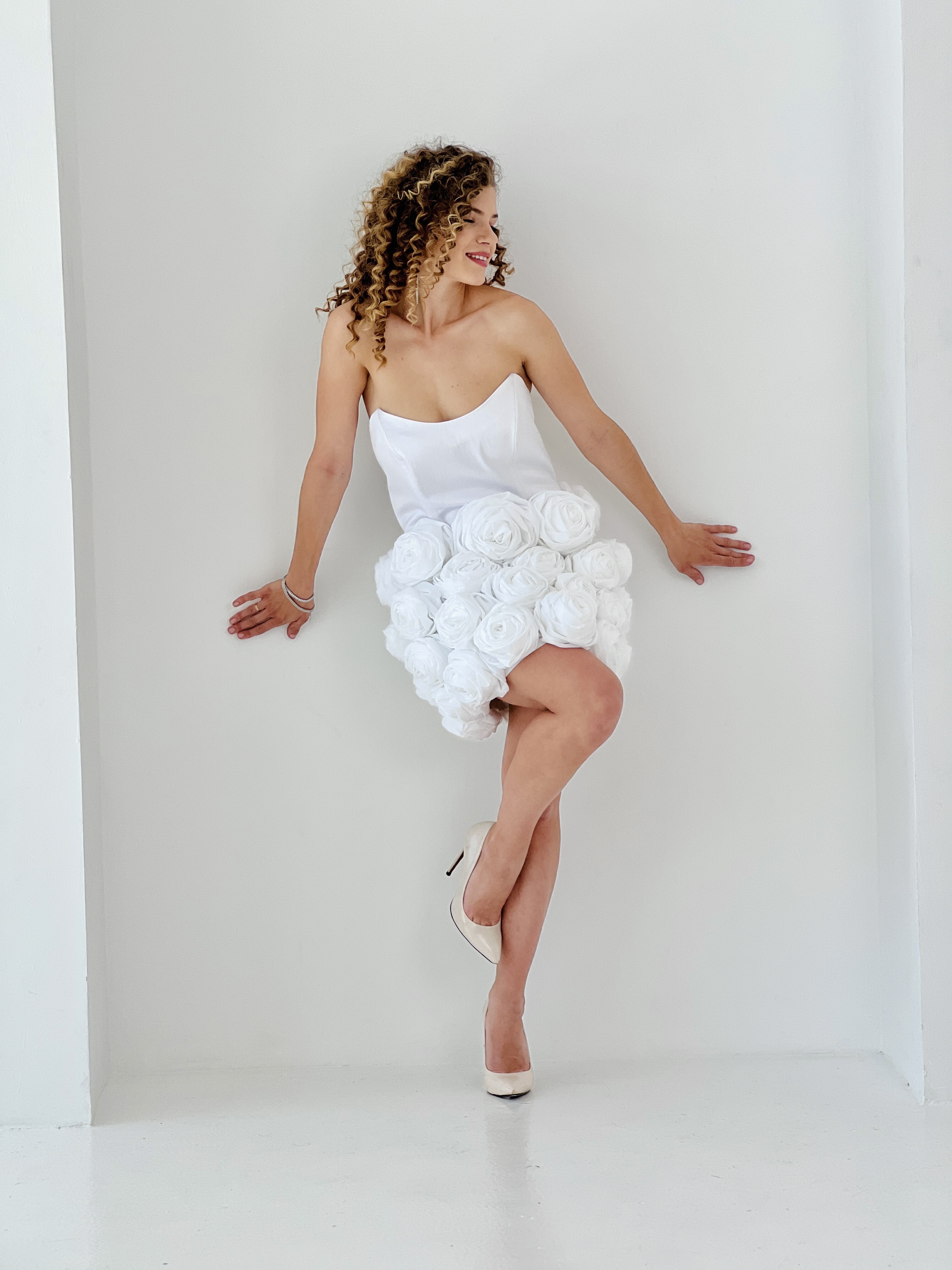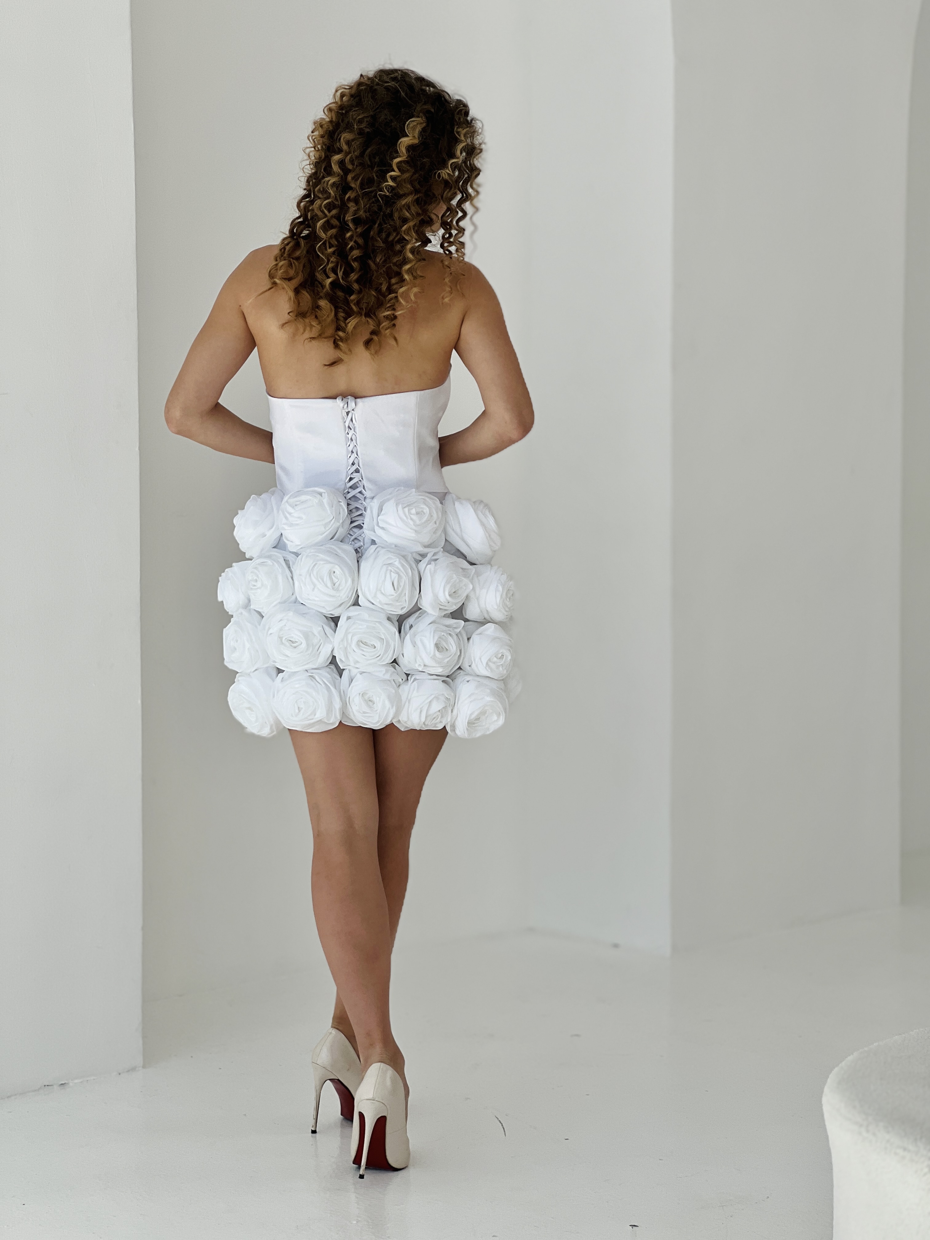 Ручной работы розы и корсетный лиф соединились в этом платье, создавая образ нежности и элегантности. Изделие выполнено из высококачественных материалов, которые обеспечивают комфорт при носке. Идеально подходит как для торжественного вечера, так и для романтического ужина