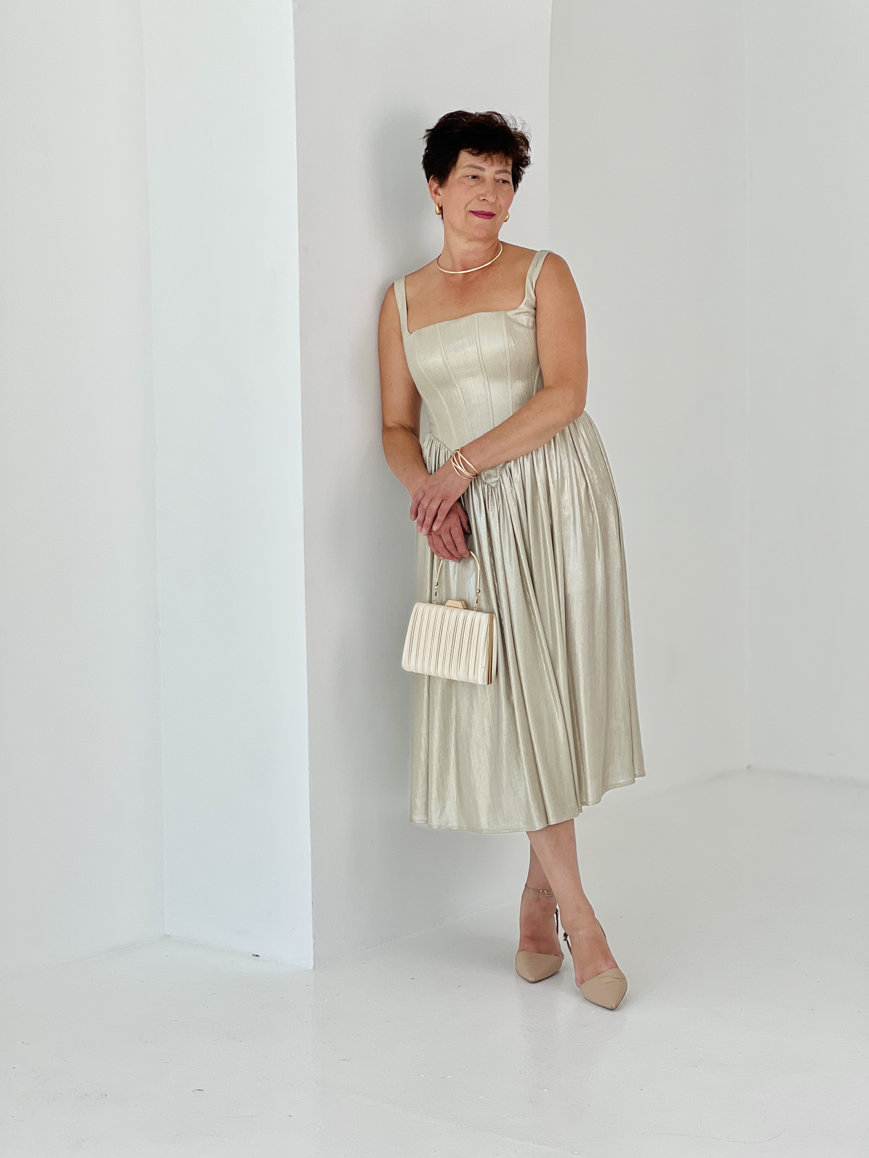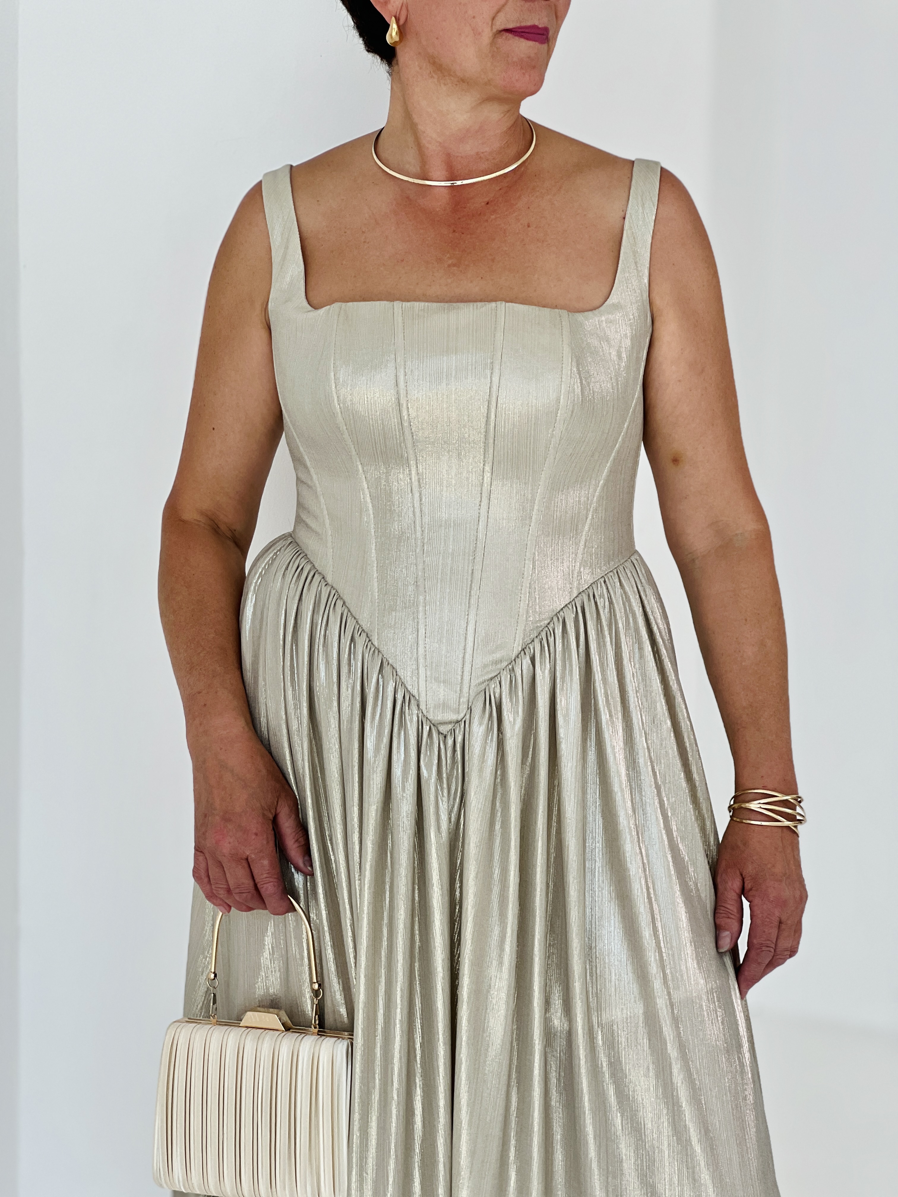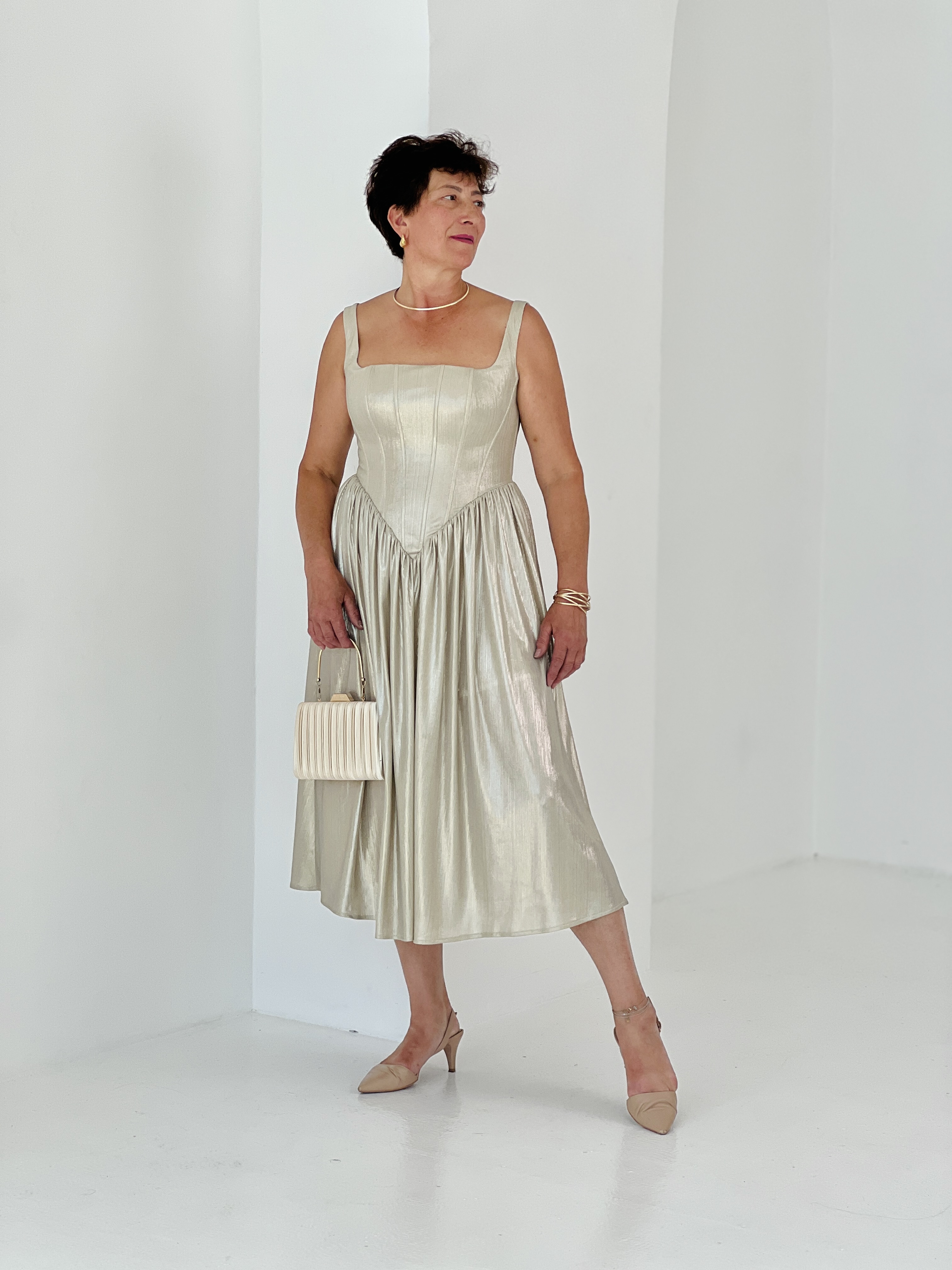 Корсетный лиф подчеркнет все ваши достоинства, а играющая светом ткань придаст фигуре невесомость и элегантность. Юбка необычной формы добавляет оригинальности и делает каждое движение женственным и грациозным. Идеально подходит как для вечерних выходов, так и для особых событий! Пусть ваше сияние будет ярче всех звезд!