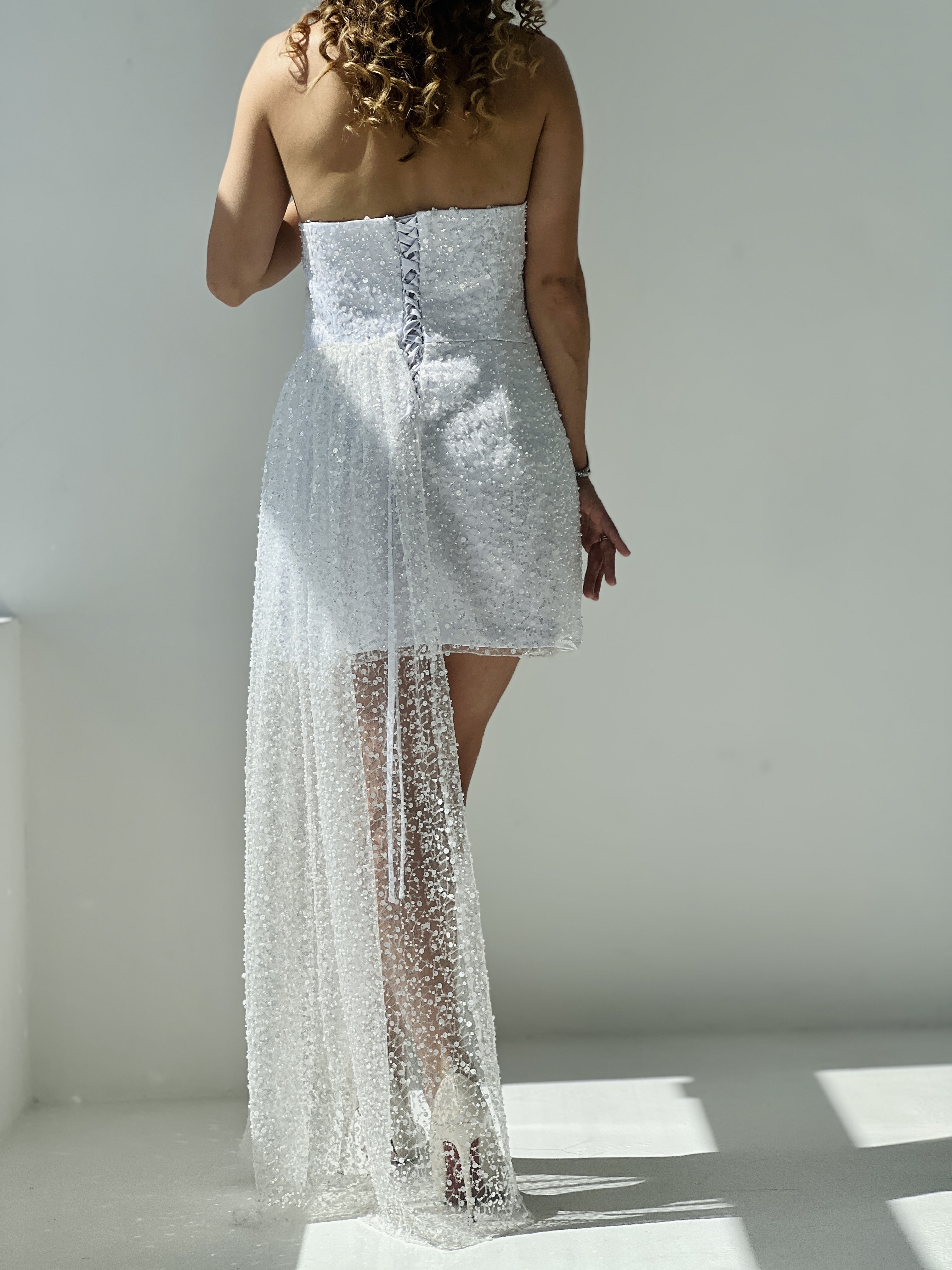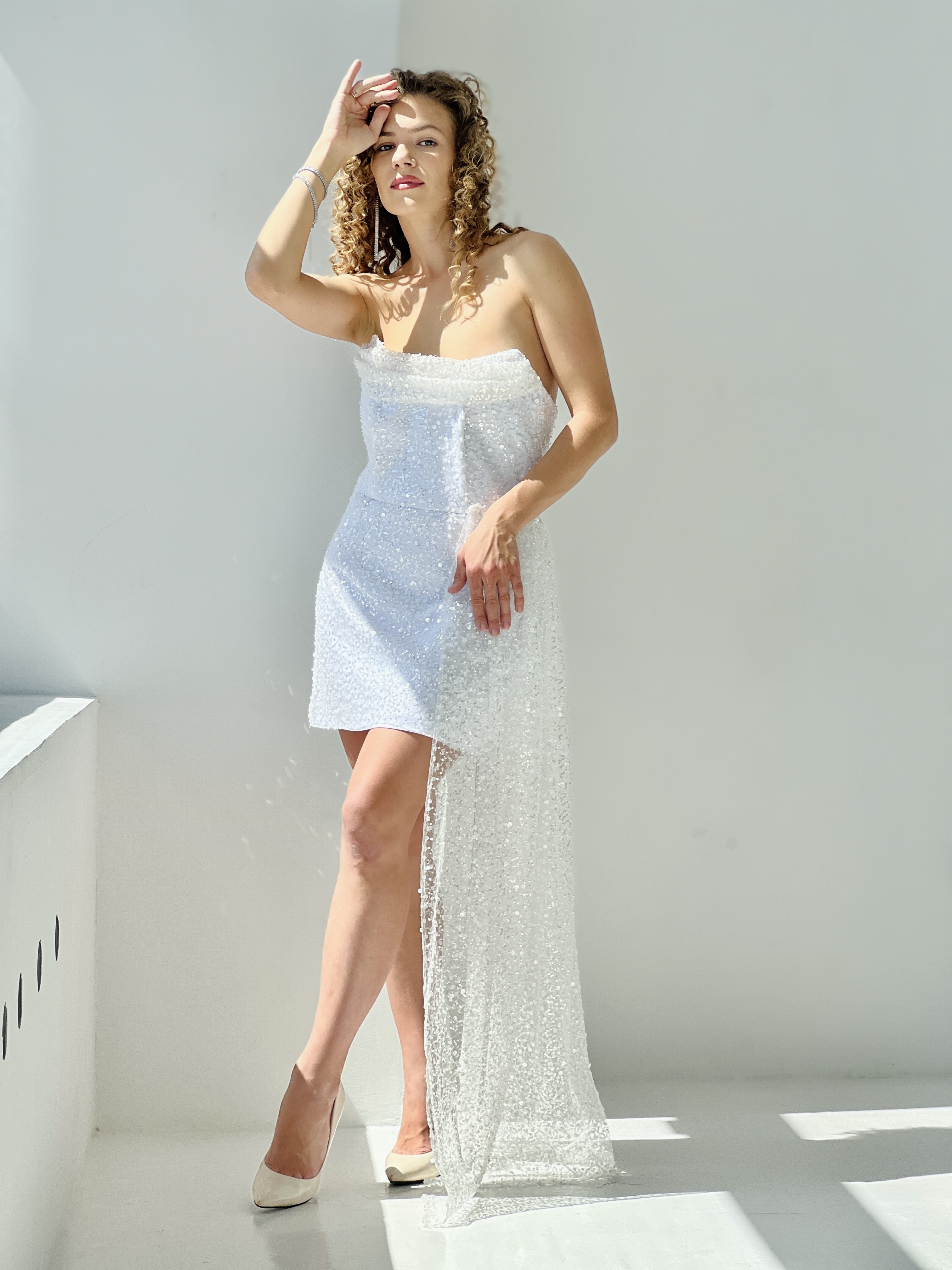Платье вышито пайетками, бусинами и бисером, создавая впечатляющее сияние и роскошь. Каждый элемент декора тщательно подобран, подчеркивая элегантность модели. Переливающиеся оттенки создают неповторимый визуальный эффект, привлекающий взгляды окружающих. Стильное платье станет звездой любого мероприятия – от коктейльной вечеринки до праздничного бала. Выглядите неотразимо благодаря этому изысканному наряду!