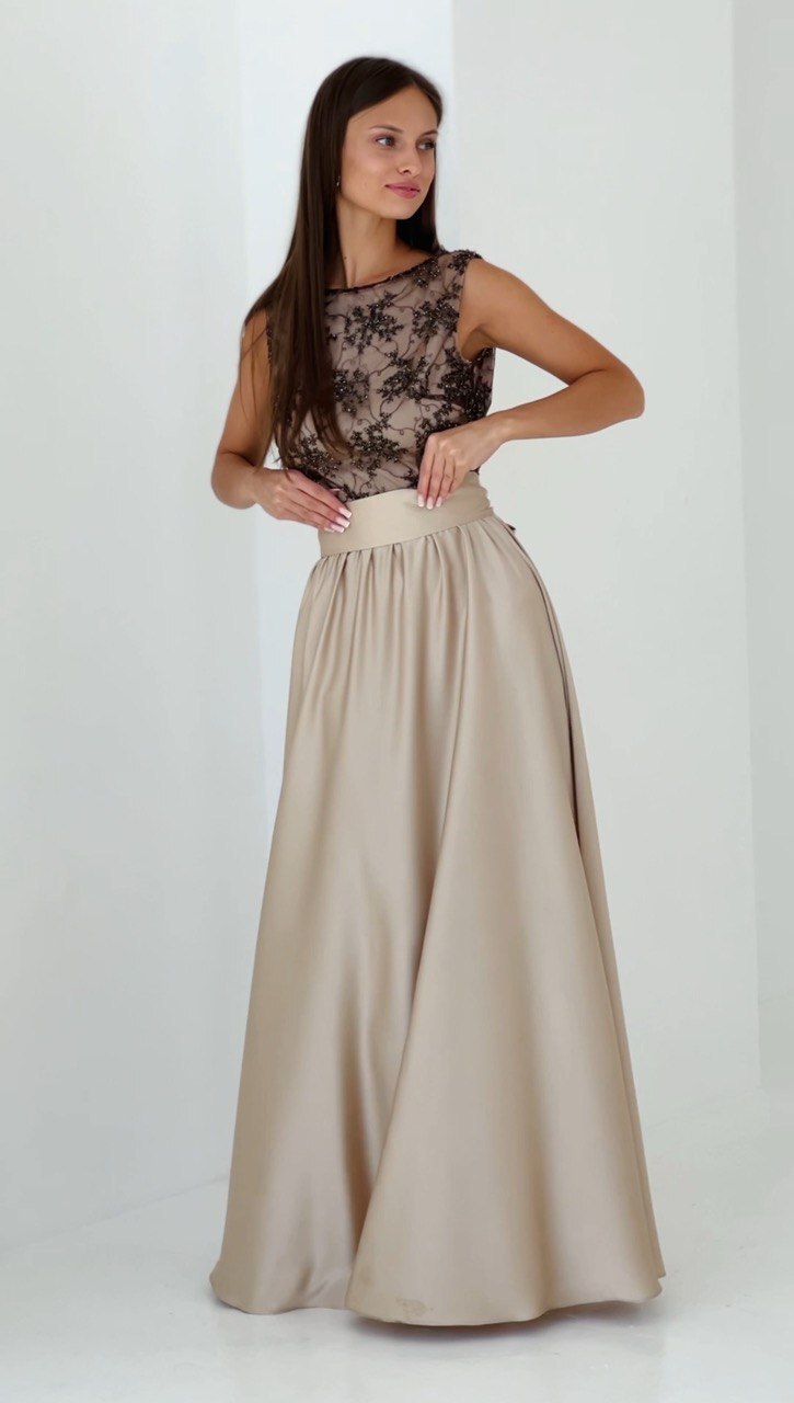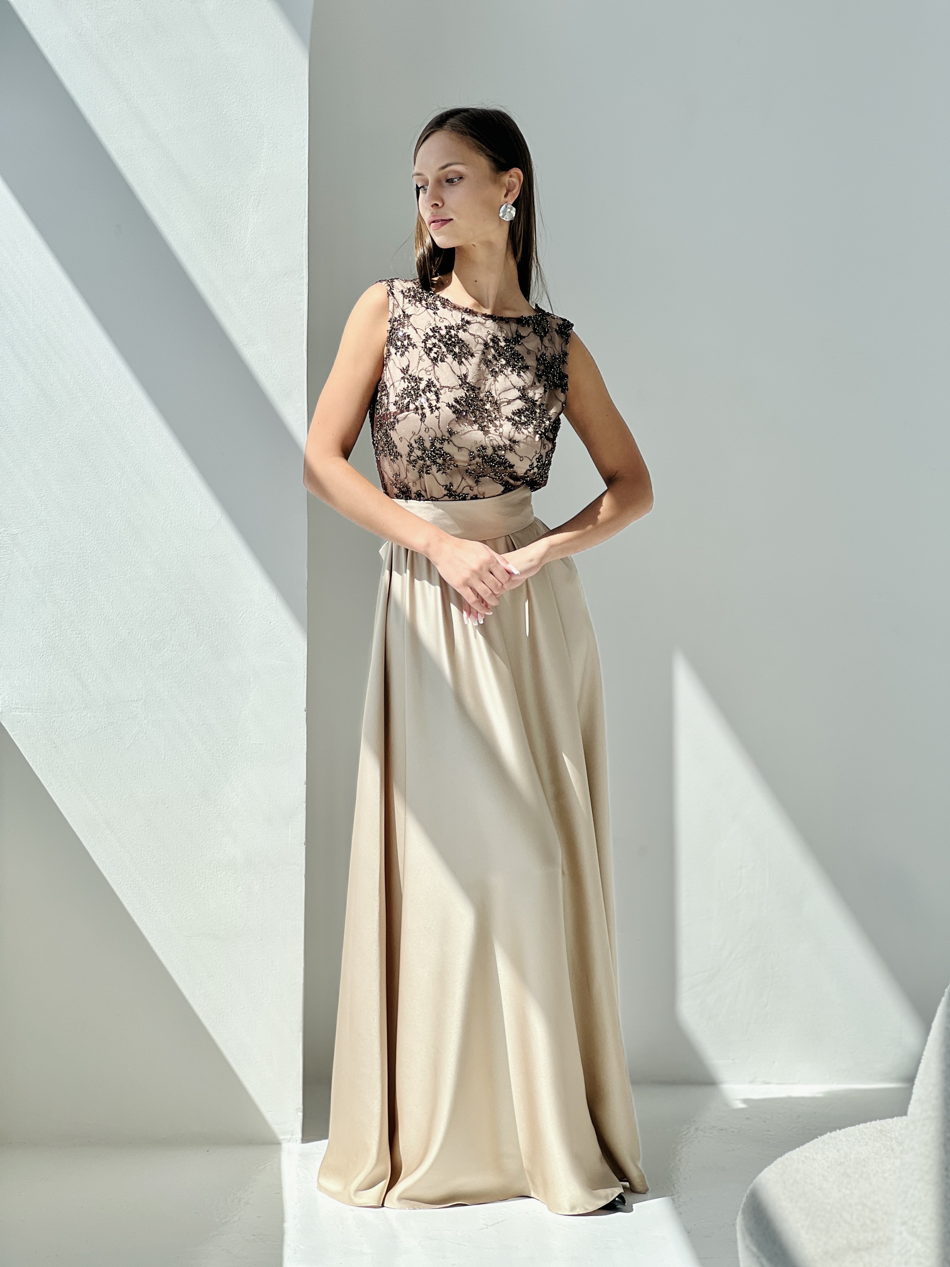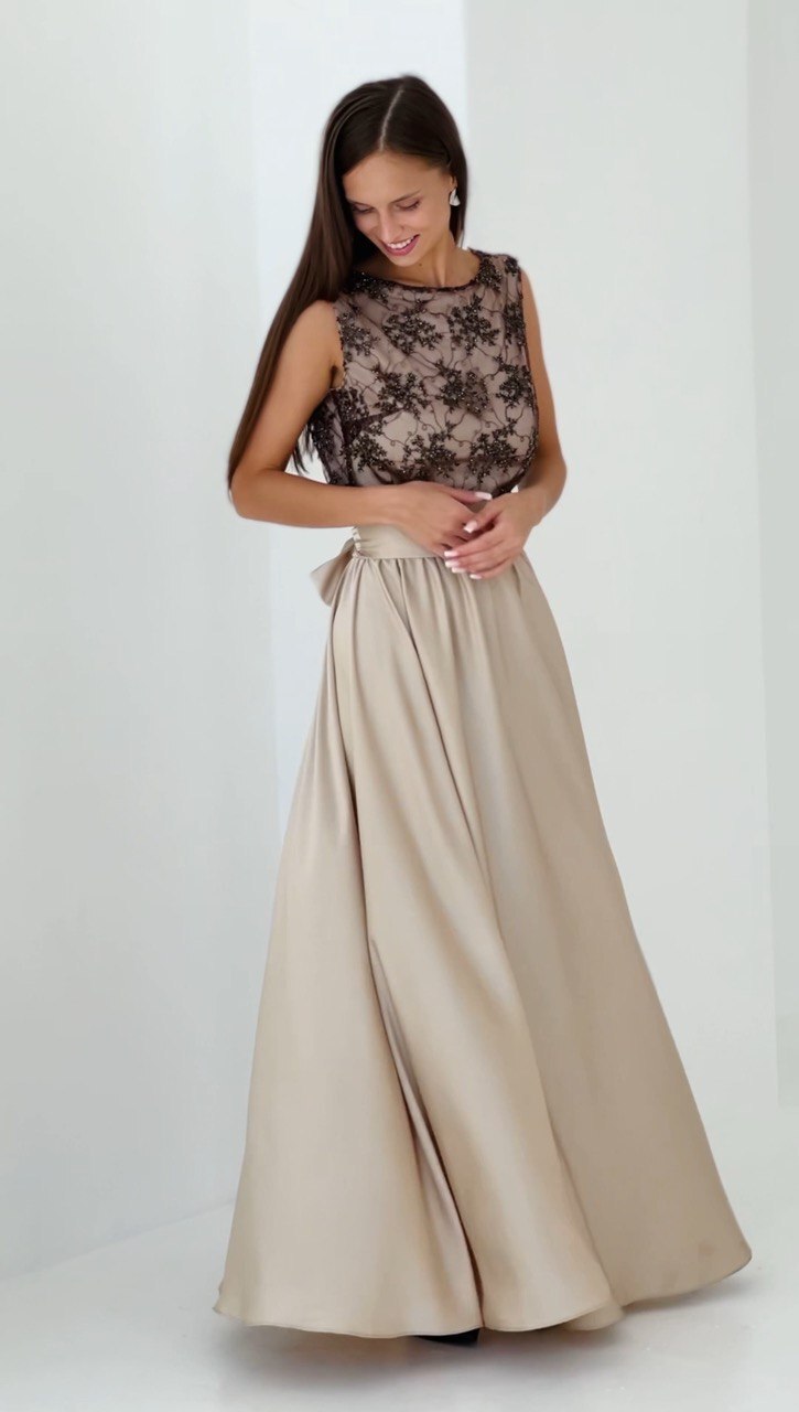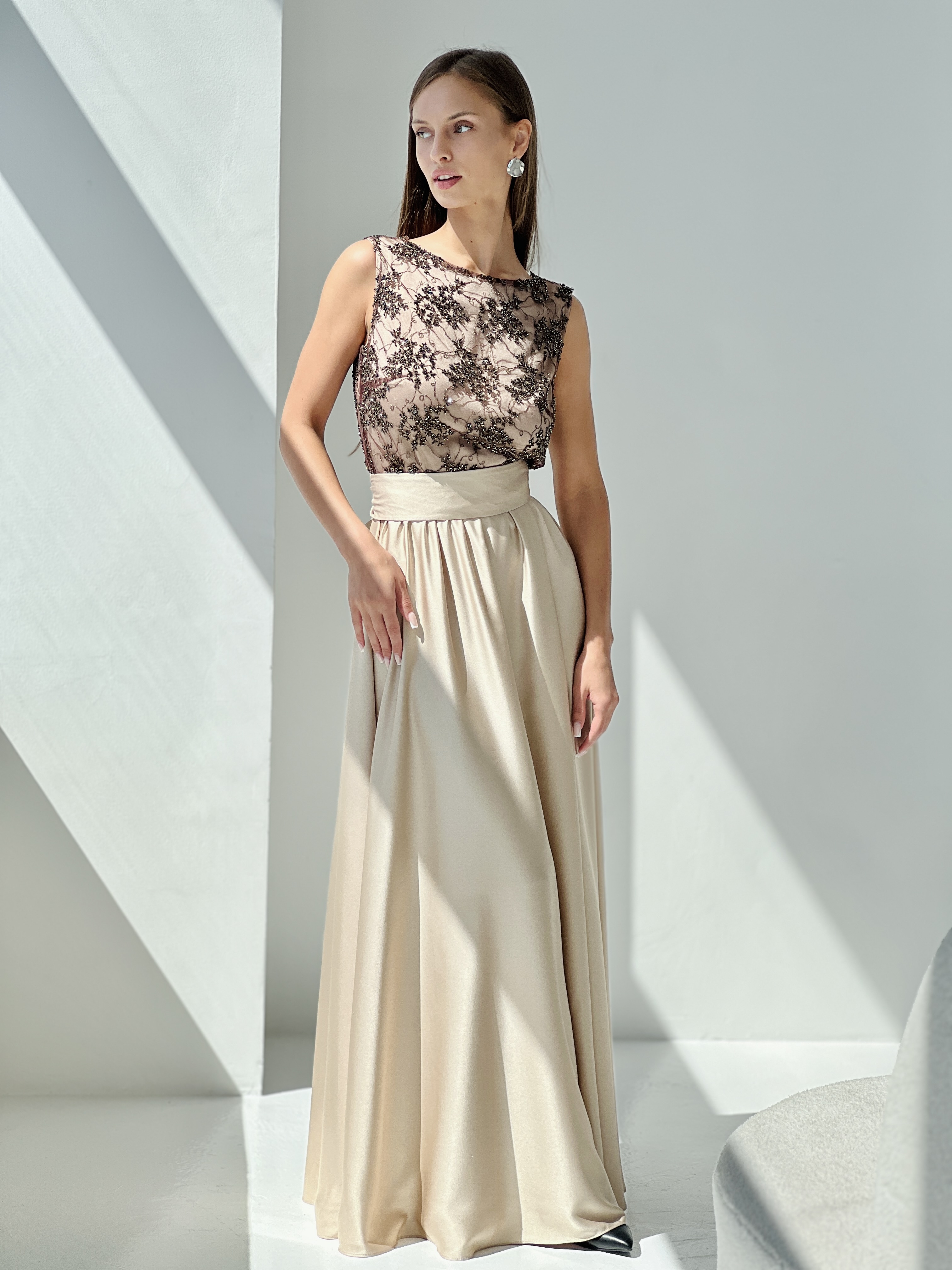 Платье очарует вас своим комфортом и изысканностью — вы будете чувствовать себя настоящей звездой с блеском на коже и волшебством вокруг! Открытая спинка с кружевными фестонами завораживает. Вышивка стеклярусом и бисером переливаются при свете. Юбка из шелкового атласа красиво летает при движении и добавляет походке соблазнительную плавность.